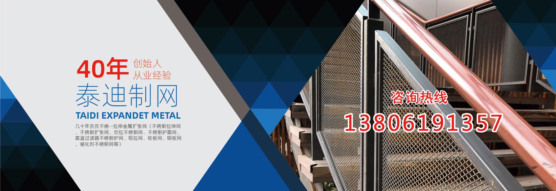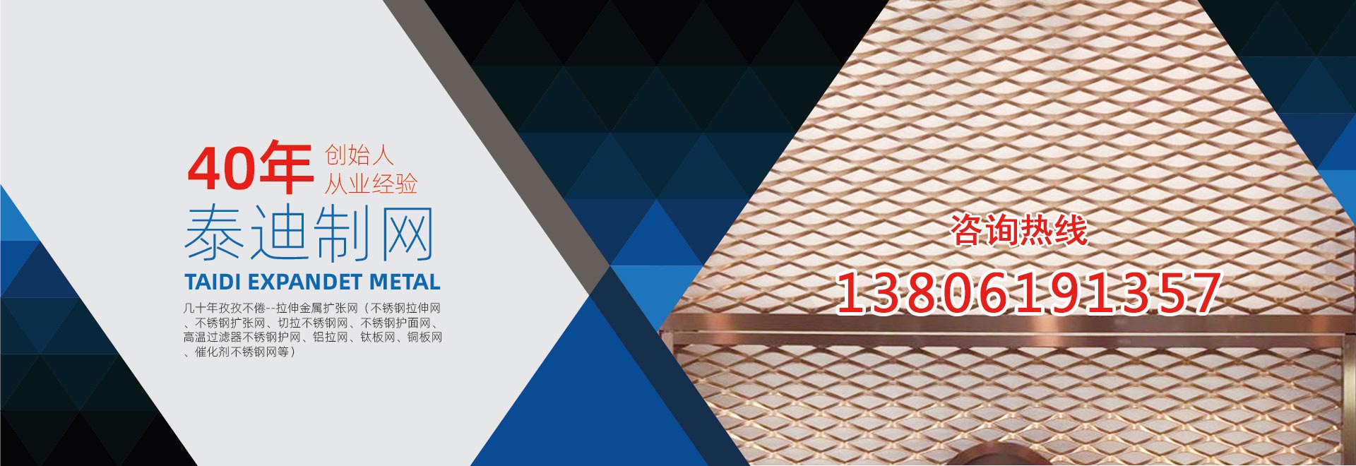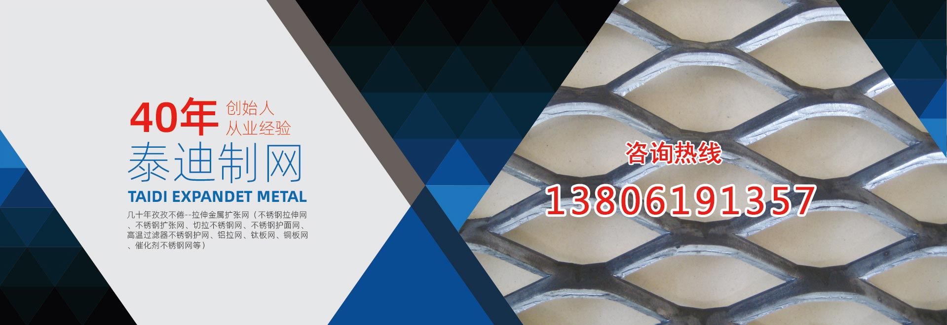 無錫泰迪環??萍加邢薰荆且患覍I生產金屬拉伸擴張網的企業。公司特長是:不銹鋼擴張網、拉伸擴張小孔、微孔網、奧氏體不銹鋼304、316網、超奧氏體不銹鋼網、鎳基不銹鋼的切拉擴張網生產、加工。產品包括:不銹鋼拉伸網、不銹鋼擴張網、切拉不銹鋼網、不銹鋼護面網、高溫過濾器不銹鋼護網、 板式催化劑不銹鋼網。復合針孔鋁板、針孔鋁拉網、微孔鋁板、微孔吸音鋁板、針孔吸音鋁板、微穿孔不銹鋼網、不銹鋼電池集流網、電池用不銹鋼網、鈦板網、不銹鋼板網、鎳板網、銅板網。鉛板網、超奧氏體不銹鋼板網、鎳基不銹鋼板網,鋁拉網、鋁板拉伸網、拉伸屏蔽網、不銹鋼過濾器網、不銹鋼過濾網,不銹鋼濾芯網、濾筒不銹鋼網,音箱喇叭網罩。公司前身為13年成立的無錫泰迪金屬制品有限公司。公司創始人陳正芳先生從事切拉擴張網專業四十年,公司產品在總工程師繆志明(原上海中國鋼板網廠工程師)指導下,一直保持優良品質。